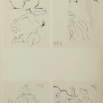 The book consists of 32 pages of text followed by Picasso’s illustrations which reproduce three sketchbooks from 1959. The works deal with all stages of bullfighting and Georges Boudaille highlights Picasso’s persevering loyalty to portraying the theme of bullfighting since 1890. The plates are black & white, sepia and color, and many are single-sided. Part of the sketchbooks have never been found (the drawings of March 2 and 3, notably representing Jacqueline on horseback). Among the most astonishing images, there is a Christ on the cross saving a picador from death.