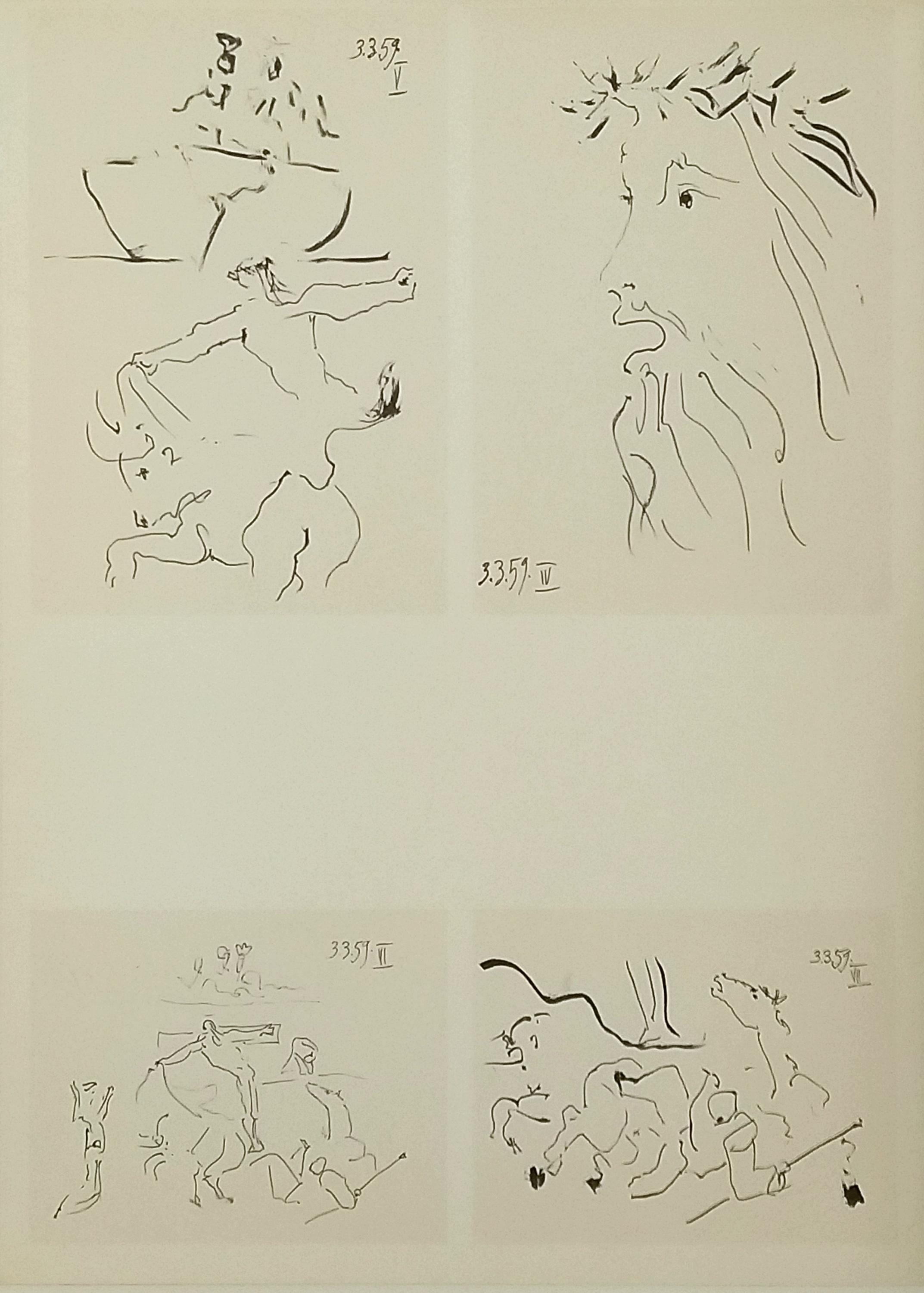 These drawings by Picasso covered a period from 1950 to 1960, during which time he enjoyed seeing Dominguin bullfight in the arenas of Nîmes, Arles, Frejus and Vallauris. The leading copies of this publication contain a series of reproductions of color drawings selected from the first two notebooks, as well as a lithograph of February 7, 1961 Pablo Picasso created the cover page and illustrations using a series of three sketchbooks. The technique utilized a quasi systematic use of brush ink wash.