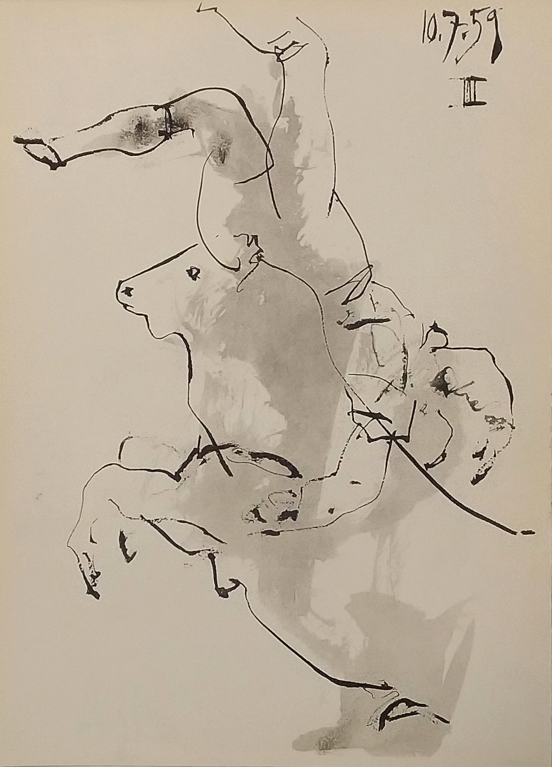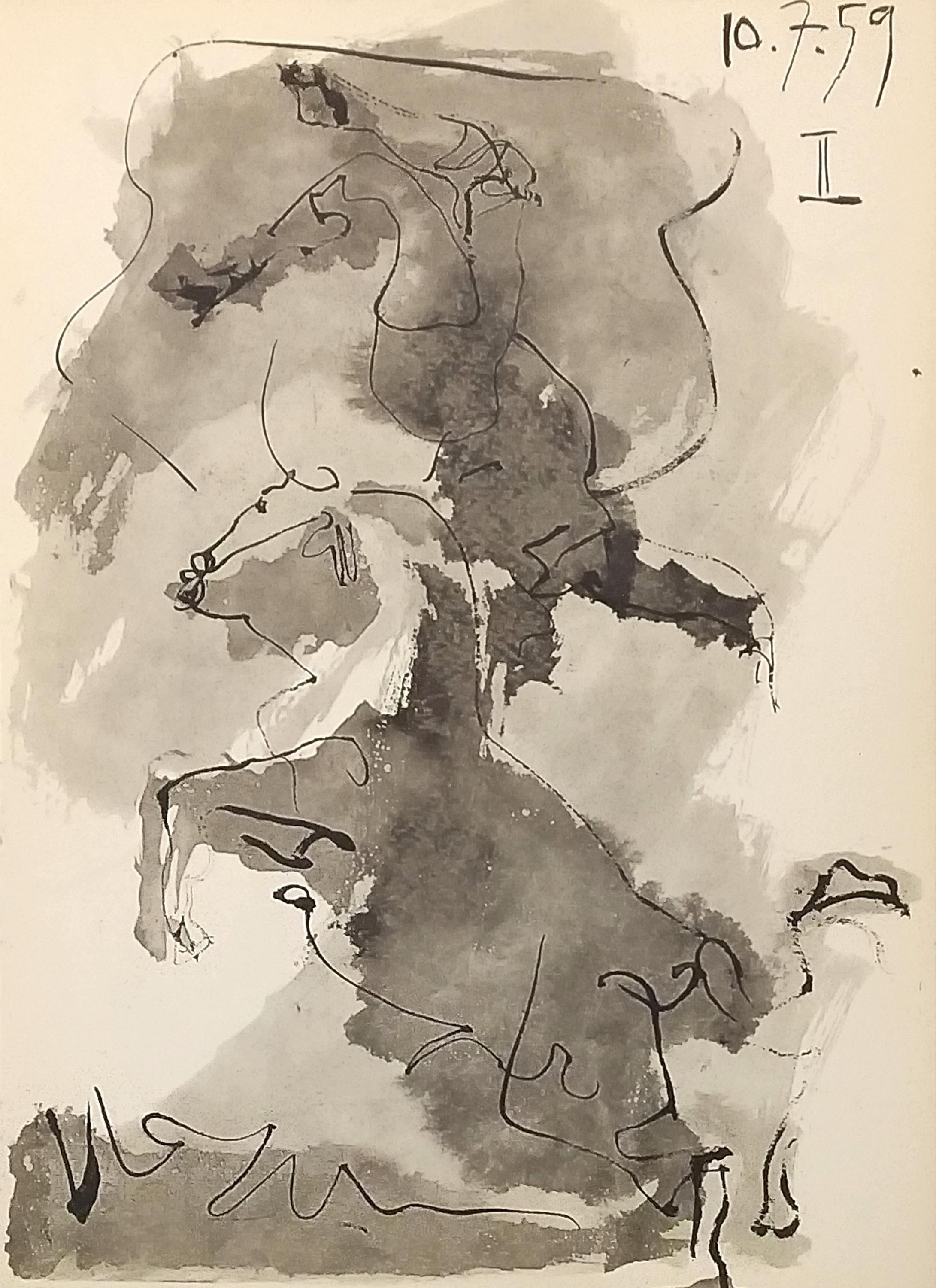 These drawings by Picasso covered a period from 1950 to 1960, during which time he enjoyed seeing Dominguin bullfight in the arenas of Nîmes, Arles, Frejus and Vallauris. The leading copies of this publication contain a series of reproductions of color drawings selected from the first two notebooks, as well as a lithograph of February 7, 1961 Pablo Picasso created the cover page and illustrations using a series of three sketchbooks. The technique utilized a quasi systematic use of brush ink wash.