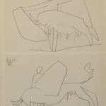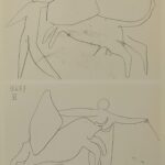 The book consists of 32 pages of text followed by Picasso’s illustrations which reproduce three sketchbooks from 1959. The works deal with all stages of bullfighting and Georges Boudaille highlights Picasso’s persevering loyalty to portraying the theme of bullfighting since 1890. The plates are black & white, sepia and color, and many are single-sided. Part of the sketchbooks have never been found (the drawings of March 2 and 3, notably representing Jacqueline on horseback). Among the most astonishing images, there is a Christ on the cross saving a picador from death.