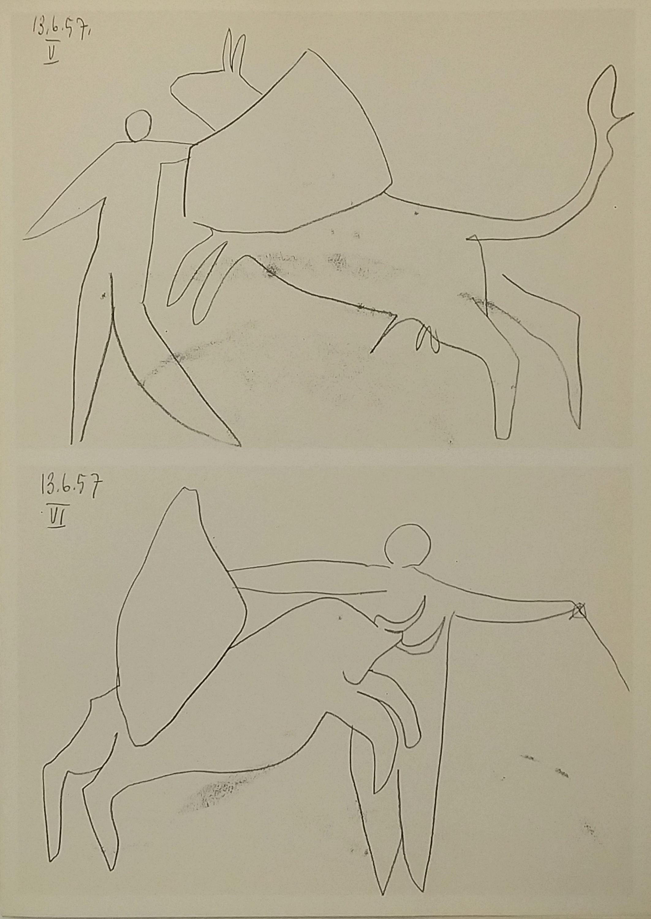These drawings by Picasso covered a period from 1950 to 1960, during which time he enjoyed seeing Dominguin bullfight in the arenas of Nîmes, Arles, Frejus and Vallauris. The leading copies of this publication contain a series of reproductions of color drawings selected from the first two notebooks, as well as a lithograph of February 7, 1961 Pablo Picasso created the cover page and illustrations using a series of three sketchbooks. The technique utilized a quasi systematic use of brush ink wash.
