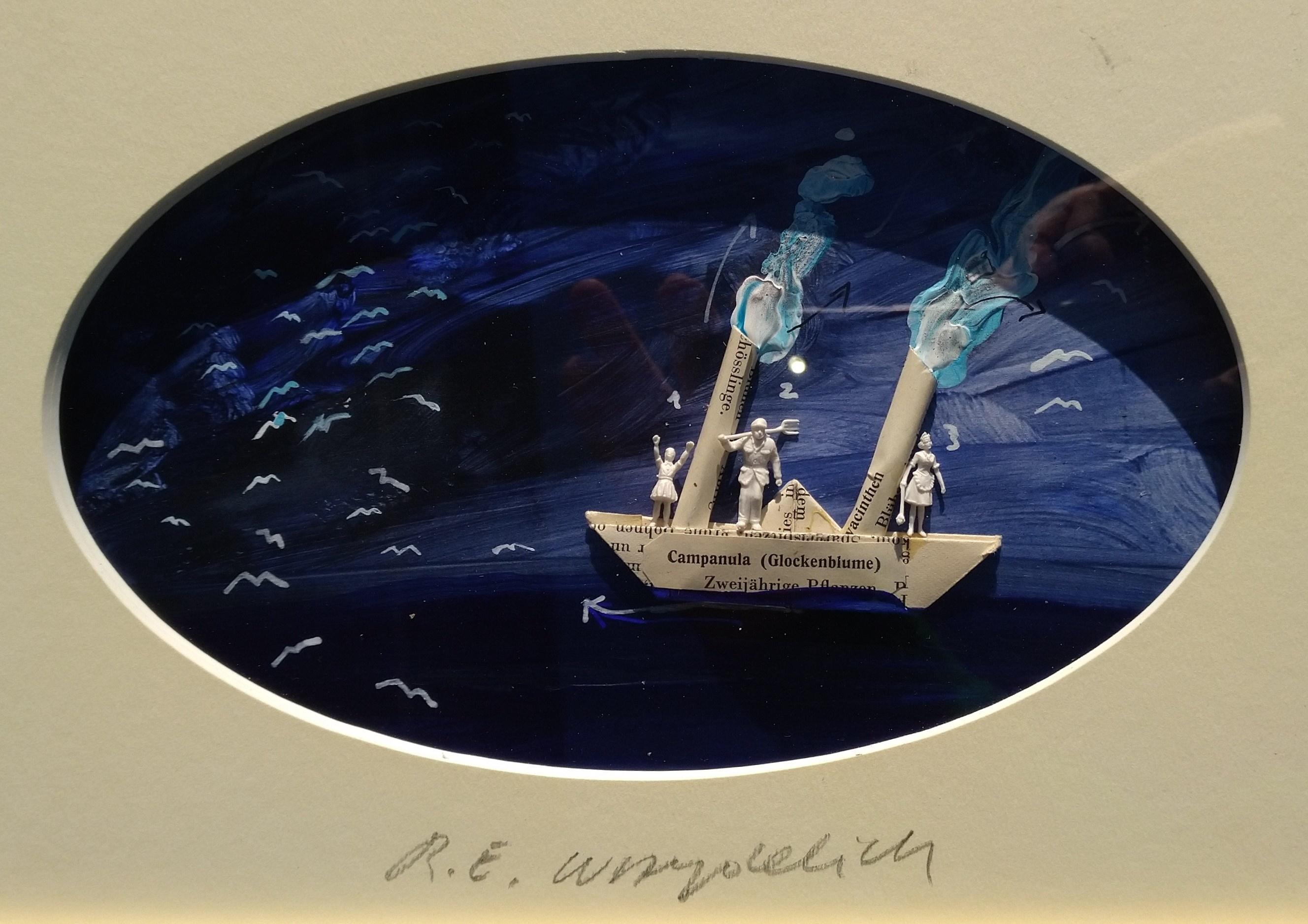Roland Anstett erinnert an seine Aktion in Straßburg 1995: „Als Waydelich vor der Kathedrale, Place du Château, eine Betongruft mit Alltagsobketen füllte (Die Gruft der Zukunft 3790 n. Chr.), da bezeichneten ihn einige sogenannte kluge Köpfe der Intelligenzija auch als Doddel!“ wie Bis Repetita „Da schreibst du ‚E: siehe oben‘ hin, zurück zum Anfang, gleicher Text. Ich will nichts verändern.“ Er lacht. Und erzählt uns dann doch etwas über das E, dass für Émile steht und in seiner Signatur R.E. Waydelich vorkommt: „Am Anfang habe ich mit R signiert. Aber in meiner Familie gibt es 6 davon: Roger, Roland, Robert, usw. 1978 stand auf der ersten Seite der regionalen Elsässer Zeitung Dernières nouvelles d’Alsace: Roland Waydelich bei Biennale in Venedig! Das ist dann schon hart… Also habe ich mir gesagt okay, ich nehme den Vornamen meines Großvaters Émile und schreibe R.E. Der Buchstabe gehört immer dazu. Und außerdem ergibt das REW (rêve, zu Deutsch: Traum)! Das war keine Absicht. Ich konnte nicht meinen zweiten Vornamen nehmen, Marcel, wie mein Vater, das hätte zu sehr nach BMW geklungen!“ wie Linie Ich entdecke, dass seine blühende Fantasie streng Kurs hält.